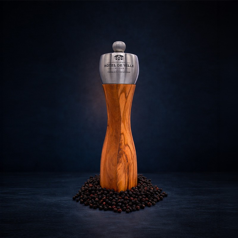 Référence incontestable des grands chefs et des tables d’excellence, découvrez le moulin à poivre emblématique Peugeot Saveurs griffé Restaurant de l'Hôtel de Ville de Crissier.